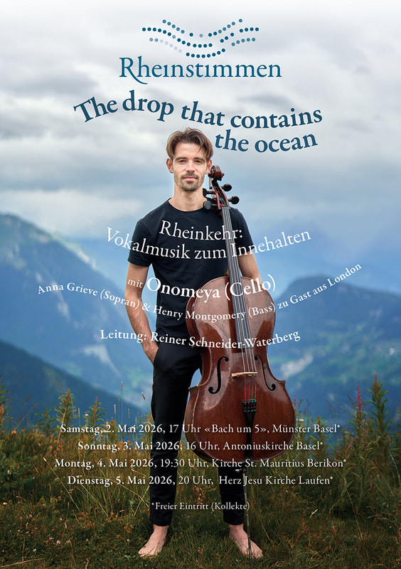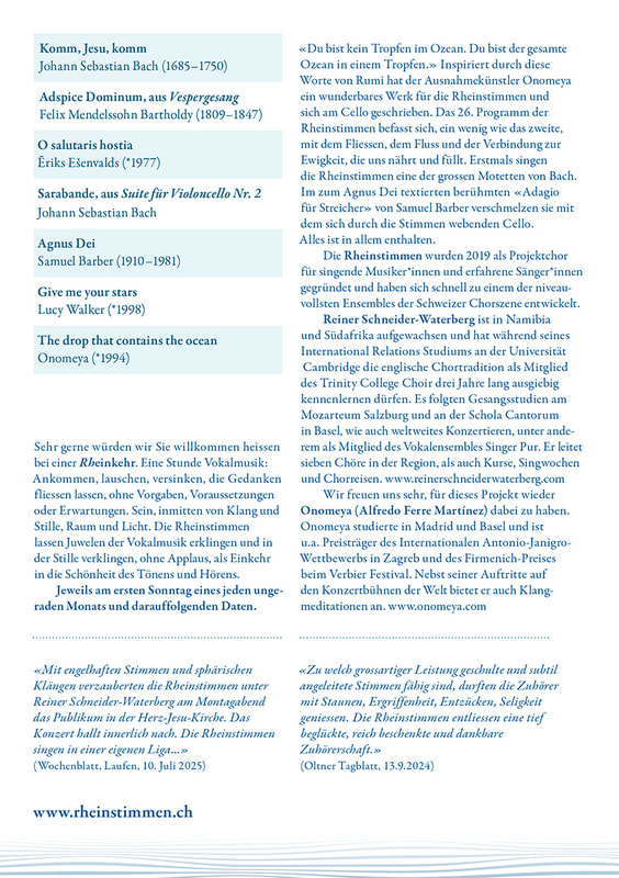 3. Mai 2026, 16 Uhr | Rheinkehr, Antoniuskirche Basel 4. Mai 2026, 19.30 Uhr | Rheinkehr, Kirche St. Mauritius Berikon (AG) 5. Mai 2026, 20 Uhr | Rheinkehr, Kirche Herz Jesu Laufen Rheinstimmen Leitung: Reiner Schneider-Waterberg Zu Gast aus London: Anna Grieve (Sopran) & Henry Montgomery (Bass) Onomeya (Cello) Johann Sebastian Bach: Komm, Jesu, komm (mit Cello) Felix Mendelssohn Bartholdy: Adspice Dominum, aus Vespergesang (für Männerstimmen & Cello) Ēriks Ešenvalds: O salutaris hostia Samuel Barber: Agnus Dei (mit Cello) Lucy Walker (*1998): Give me your stars Onomeya: The drop that contains the ocean (mit Cello)