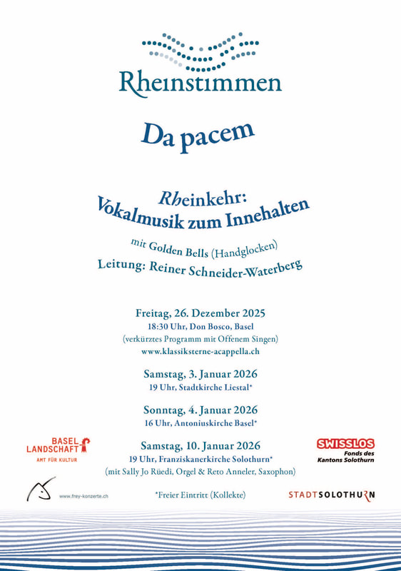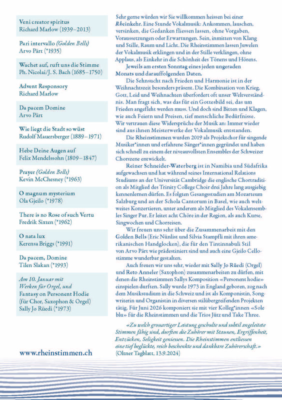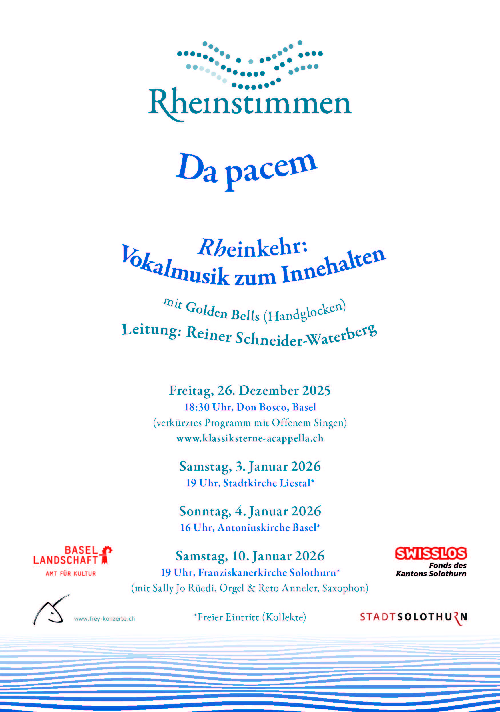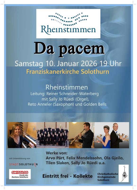 Da pacem (mit Golden Bells)Samstag, 10. Januar 2026, 19 Uhr |mit Reto Anneler (Saxophon) und Sally Jo Rüedi (Orgel), Franziskanerkirche Solothurn (freier Eintritt, Kollekte) Veni creator spiritus Richard Marlow (1939-2013) Pari intervallo (Golden Bells) Arvo Pärt (*1935) Wachet auf, ruft uns die Stimme Philipp Nicolai / Johann Sebastian Bach (1685-1750) Advent Responsory Richard Marlow Da pacem Domine Arvo Pärt Wie liegt die Stadt so wüst Rudolf Mauersberger (1889-1971) Hebe Deine Augen auf Felix Mendelssohn Bartholdy (1809-1847) Prayer (Golden Bells) Kevin McChesney (*1963) O magnum mysterium Ola Gjeilo (*1978) There is no Rose of such Vertu Fredrik Sixten (*1962) O nata lux Kerensa Briggs (*1991) Da pacem, Domine Tilen Slakan (*1993) Am 10.1. mit Werken für Orgel, und Personent hodie (für Chor, Saxophon & Orgel) Sally Jo Rüedi (*1973) Die Konzerte werden unterstützt durch: Amt für Kultur Basel-Landschaft, Swisslos-Fonds Solothurn, Stadt Solothurn, Frey Konzerte